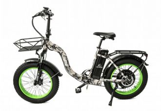 Elbike Taiga 1 Elite (Camouflage) – мощный складной электрофэтбайк с низкой рамой. Ограниченная версия, выполненная в расцветке камуфляж. Практичный и универсальный транспорт для ежедневных поездок по городу, прогулок на природе, на даче. Отличный вариант для походов, рыбалки, поездок за грибами. За счет заниженной рамы удобен для пенсионеров, людей с больными ногами (в процессе посадки не нужно высоко поднимать ногу, удобно вставать и садиться). 20-дюймовые колеса «обуты» во внедорожные покрышки, ширина которых составляет 4 дюйма. Фэтбайк хорошо едет по песку, грязи, снегу, траве, каменистым дорогам. Дополнительный комфорт при езде обеспечивает передняя амортизационная вилка. Надежные дисковые тормоза гарантируют четкое своевременное торможение. В комплекте полноразмерные крылья, задний багажник, функциональный LCD-дисплей, светодиодная фара.